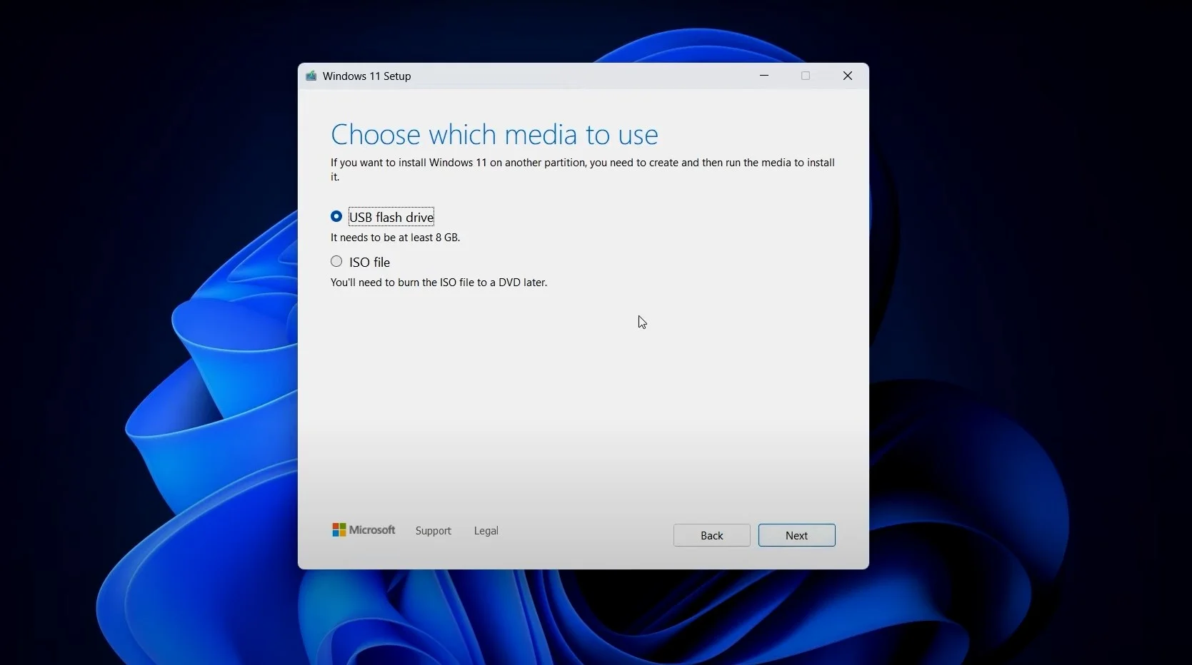 - Select installation media – Choose USB flash drive or ISO file, then click Next.